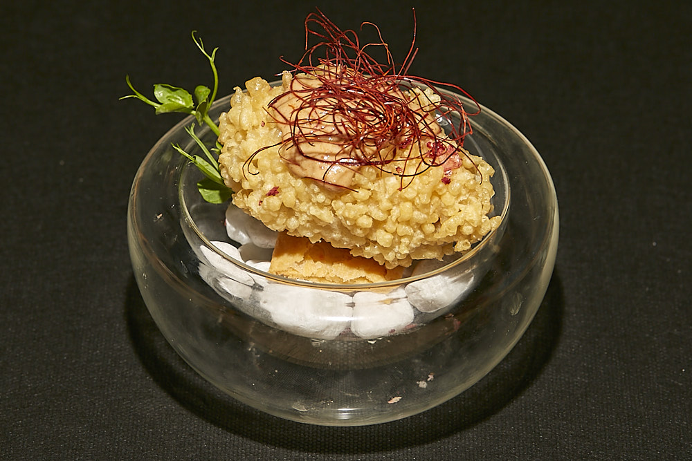 TAPA: «CEREBRO» Sesos de Ternasco de Aragón IGP en tempura jamonesa de kimchi con crujiente y parmentier de boniato. No apto para celíacos