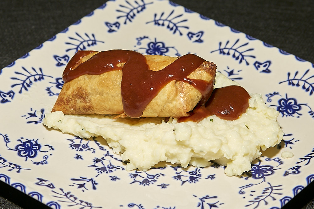 TAPA: «SUSURROS DE OTOÑO» Carrillada con setas. Base de puré de puerros con un rollo de pasta filo, relleno de carrillada, setas y emulsión de salsa de chardonnay. No apta para celíacos.