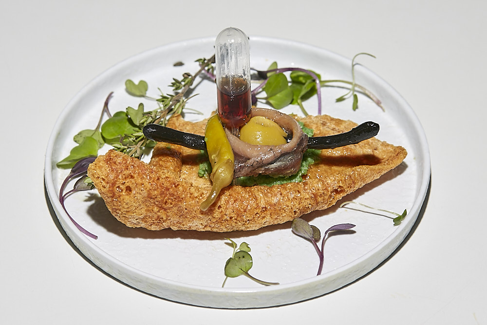 TAPA: «LA GILDA NEGRA» Brocheta comestible de tinta de calamar, que sostiene una aceituna líquida, piparra encurtida y anchoa del Cantábrico.Coronada con una gota de vermut aromático. No apta para celíacos