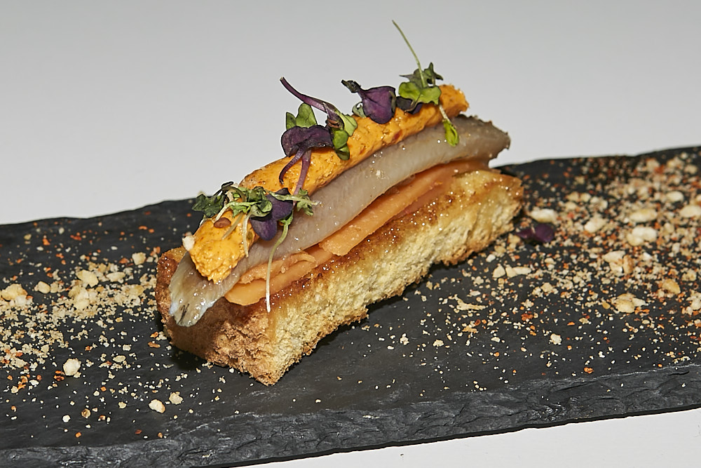 TAPA: «GUARDIA CIVIL 3.0» Lingote de pan de brioche empapado en aceite de madera de haya ahumado, gelatina de agua de tomate, arenque, con un cordón de mantequilla, compuesta de pimiento del piquillo, pepinillo, vinagre, mézclum de germinados, rabaneta china y un aire de piparras. No apta para celíacos.