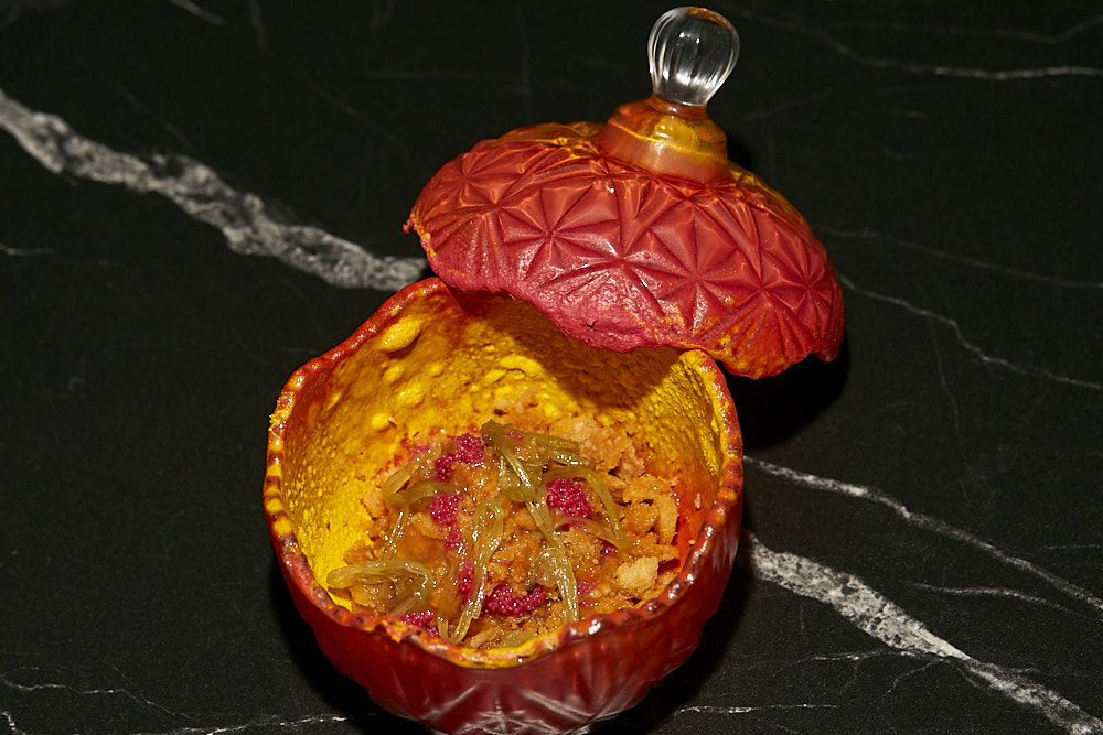 TAPA: «TIERRA MAÑA» (Sabores, texturas y colores del Reino de Aragón) Guiso de agnei ibérico con migas aragonesas, salteado de carne de cangrejos de río, puerro de las Cinco Villas, sopa de cangrejo de río y suero natural de leche. Curry verde de borraja y queso fresco de Sieso ( Villavillera), hojas de borraja frita y sus germinados terminado con caviar de trucha pirenaica. No apta para celíacos