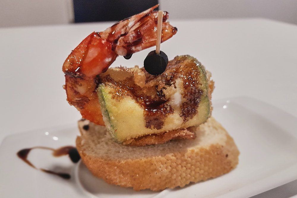 TAPA: «LA LOLA LOLITA» Langostino con calabacín, bacon y queso empanado en un montadito con una reducción de Pedro Ximenez. No apta para celíacos