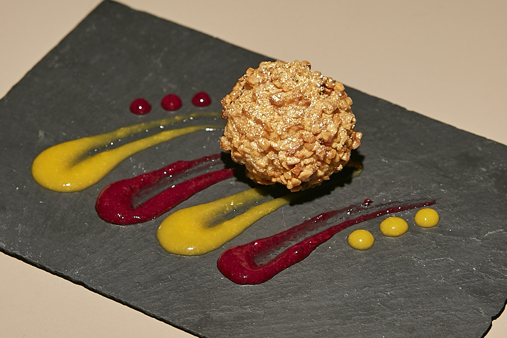 TAPA: «BOMBÓN OTOÑAL» Carrillera guisada al vino tinto con melocotón, almendra y coulis de melocotón y frutos rojos. No apta para celíacos
