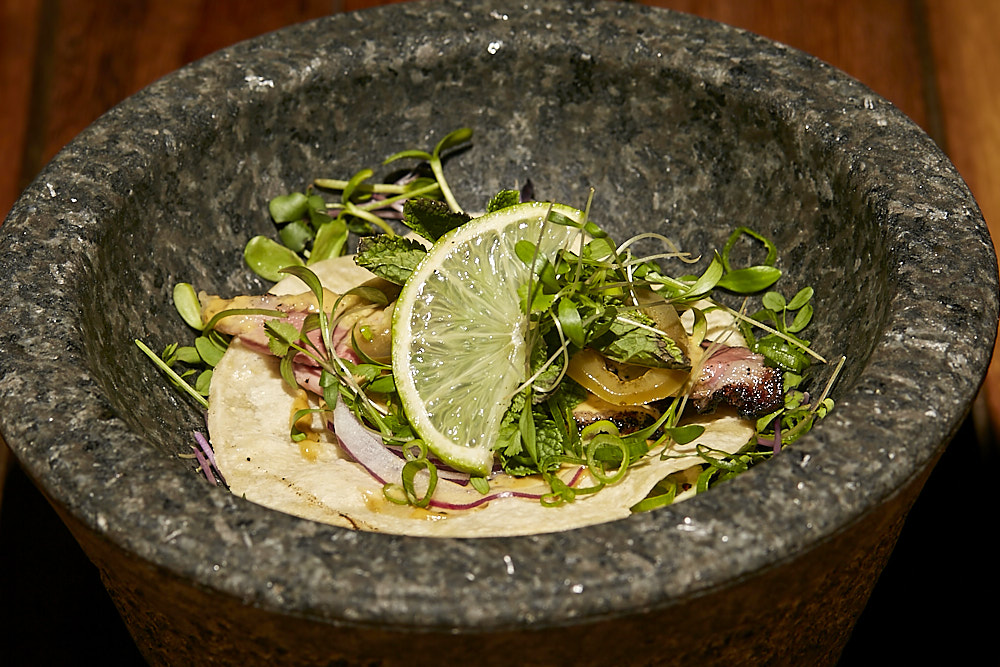 TAPA: «CODZITO DUCK» Taco de pato a baja temperatura con mayonesa de chimichanga, cebolla morada, cebolleta china y tabasco de chipotle. Apta para celíacos