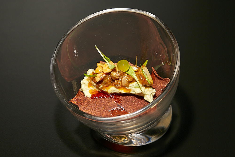 TAPA: «TONGUE-NASCO» Crujiente de tomate y cebolla morada; dipper de queso crema, aguacate y yuzu; guiso de lengua de Ternasco de Aragón IGP y cacahuetes fritos en nuestra salsa de aceite y mezcla de chiles. Apta para celíacos
