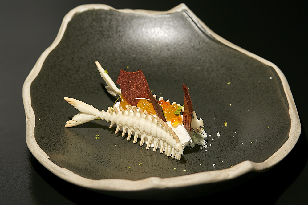 TAPA: «¿Y AHORA QUE HAGO CON LAS GALERAS? «Pastel de Galera y langostino, acompañado de crujiente, tierra de Aove Lima y cilantro, gelatina de mango y chipotle, huevas de trucha y galleta de pimientos. Apta para celíacos.