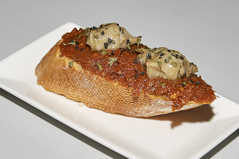 TAPA: «MONCAYO VEGANO» Pesto rojo con tomate seco, avellana, moscatel, alcachofa braseada y miel. No apta para celíacos