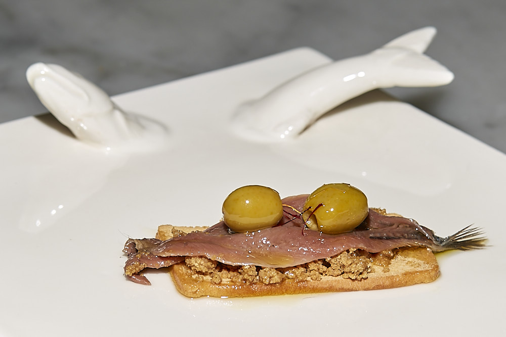 TAPA: «TIERRA DE CIERZO» Anchoa en salmuera con aceite de oliva, oliva y torrezno. Apta para celíacos