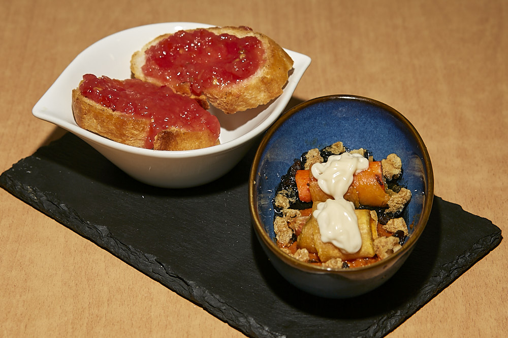 TAPA: «MAR Y TIERRA». Salsa romescu de almendras y cebolla asada como base, salsa tinta de calamar con jerez sobre la base crujiente de plátano macho con chistorra, crujiente de calabaza con palito de cangrejo gratinado con ali oli y decorado con deconstrucción de torreznos y pasas al moscatel. No apta para celíacos.