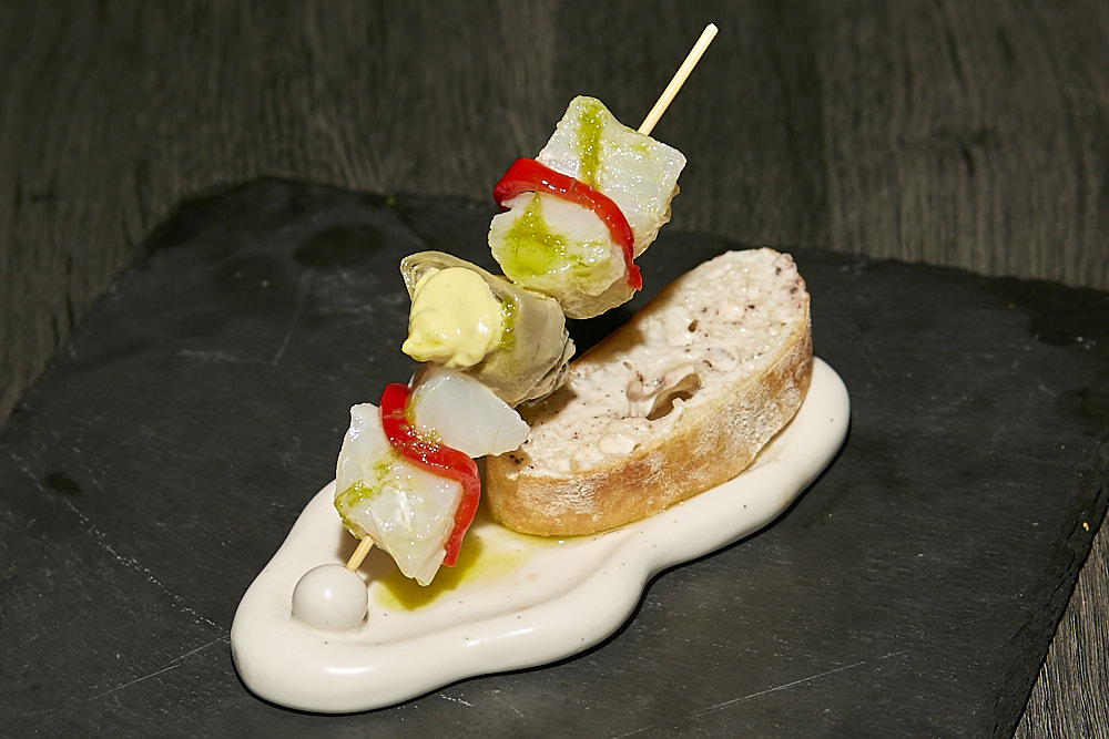 TAPA: «ALCACHOFA DEL ATLÁNTICO» Tierna alcachofa conservada en AOVE junto con bacalao aliñado, picante o no, sobre mousse de anchoa del cantábrico. Apta para celíacos