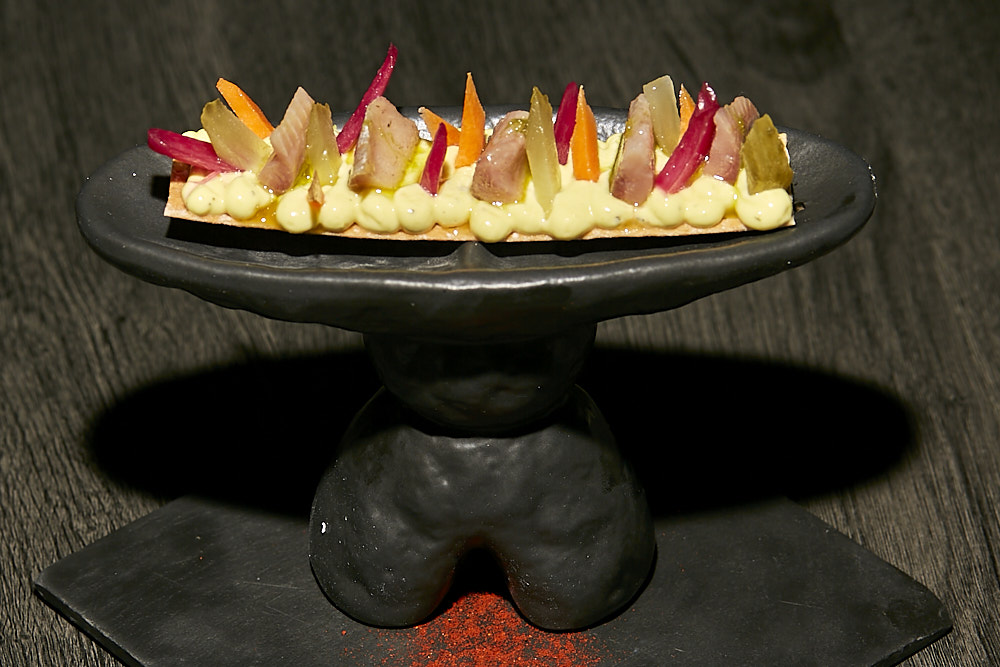 TAPA: «CARNAVAL» Arenque ahumado y encurtidos varios sobre una salsa dulce, especial de la casa, y acabada con AOVE y pistacho. Apta para celíacos