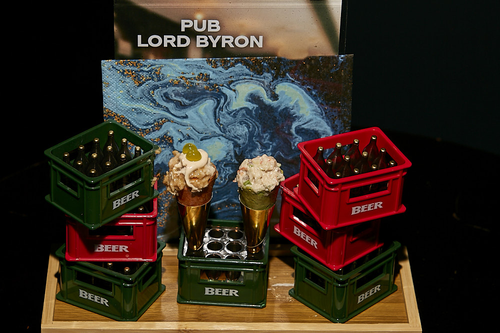 TAPA: «CHANGURRICO 2.1» Dos cucuruchos pequeños, primer cucurucho de tomate con changurro y mahonesa con wasabi, segundo cucurucho de albahaca con coctel de gambas y coronado. No apta para celíacos
