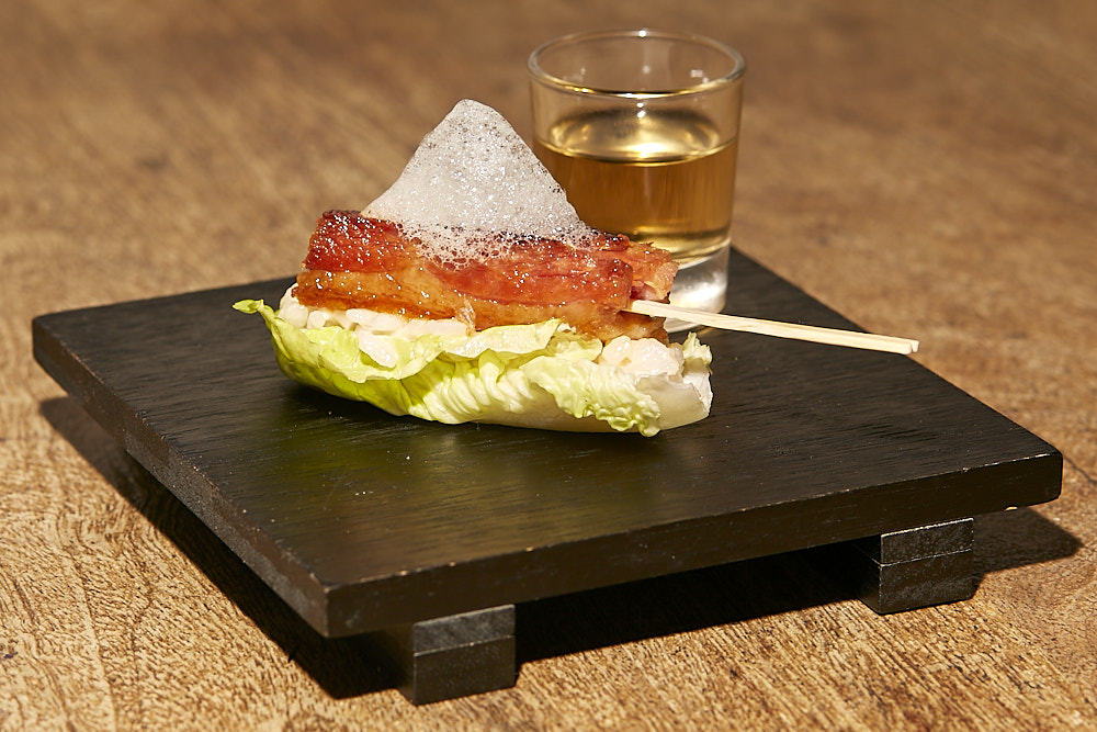 TAPA: «MAÑITORI» Yakitori de pancenta Duroc marinada en teriyaki de moscatel, arroz aromatizado XO y aire de azafrán, miel y tomillo en taco koreano. La tapa irá acompañada de un chupito de soju macerado con melocotón de Calanda y jengibre. Apta para celíacos