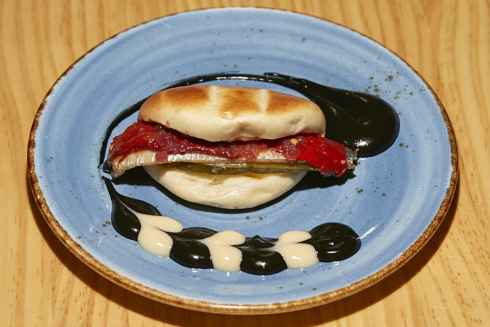 TAPA: «LA DETENIDA»Caviar de vinagre, bastarda, pepinillo agridulce, pimiento del piquillo a la piedra, arenque ahumado envuelto en pan bao, acompañado con alioli negro y alioli blanco. No apta para celíacos.