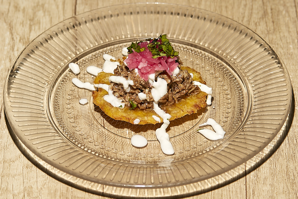 TAPA: «WHISKY & LIMA» Patacón con carne mechada de cerdo marinada con whisky, soja & especies, salsa picante de lima & miel, acompañada de yogurt, cebolla morada encurtida & cilantro fresco. No apta para celíacos