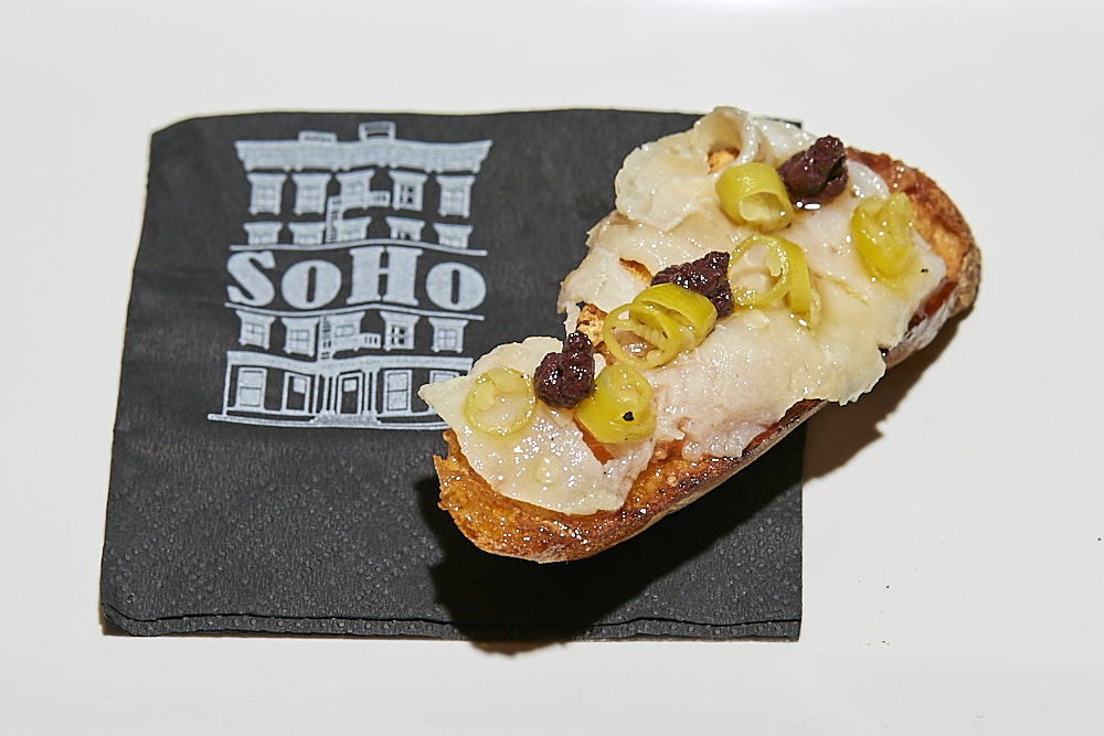 TAPA: «BA CALAO»Pan tostado al grill, tomate natural rallado, bacalao ahumado, paté de aceituna negra y piparra. No apta para celíacos.