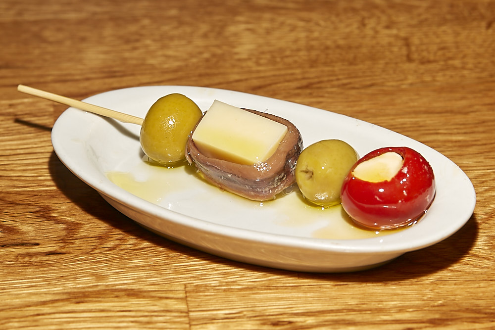 TAPA: «LA CHURRI» Banderilla con dado de queso emmental, anchoa, olivas, pimiento relleno de queso y acabado con AOVE. No apta para celíacos