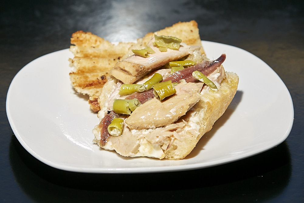 TAPA: «VENTRESKING» Bocatin de ventresca con mahonesa, filete de anchoa y picado de piparra. No apta para celíacos