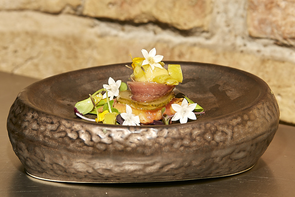 TAPA: «LA ULTIMA Y NOS VAMOS» Esfericificación de oliva verde, rodeada de anchoa del cantábrico, sobre pepinillo y trozos de piparra, todo bañado en AOVE y vinagre de vino tinto. No apta para celíacos