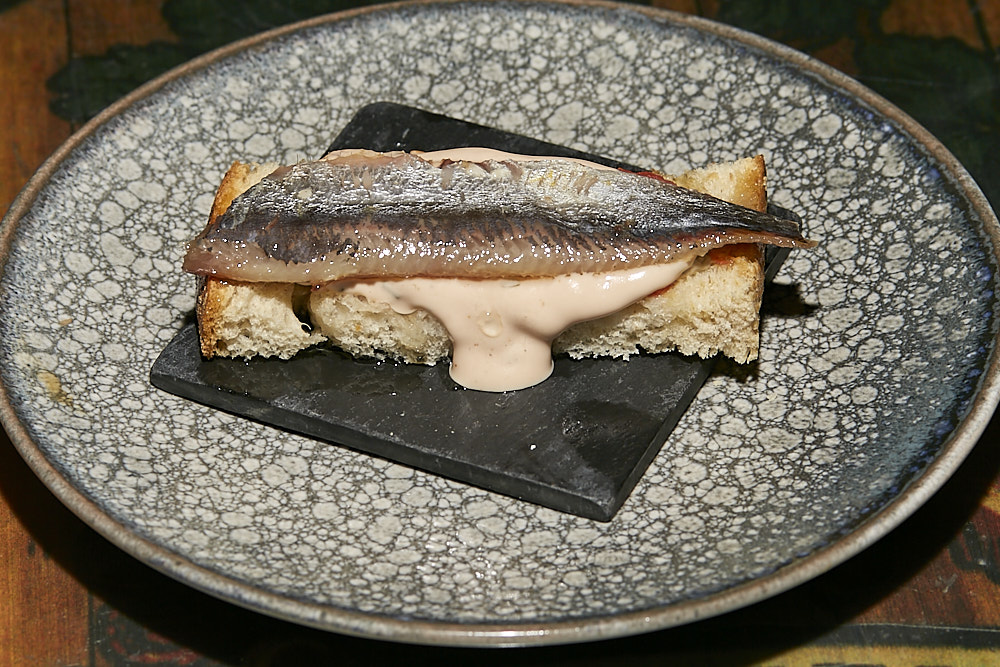 TAPA: «MAR Y HUERTO» Sardina ahumada sobre salsa tartara de encurtidos y tomate. No apta para celíacos.